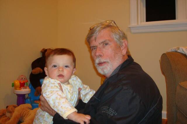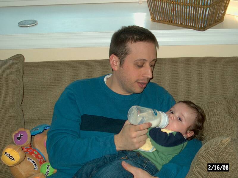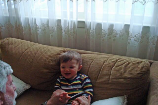 Jake , Aunt Jess and Uncle Greg came down from Woburn to celebrate Pop-E's birthday. Here I am with Pop-E. Does it look like I am trying to kiss his foot as a birthday present?