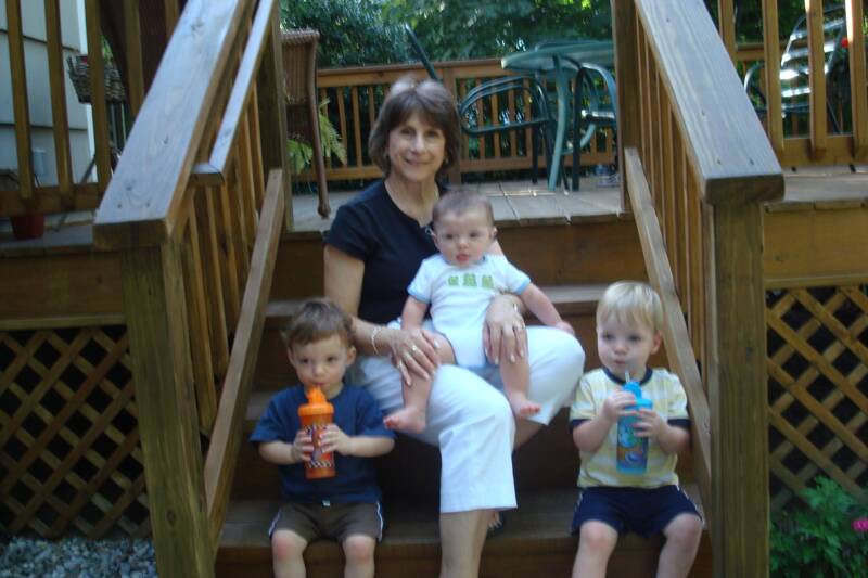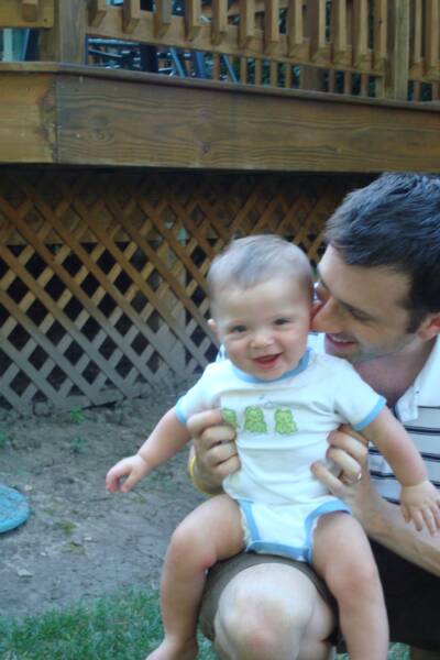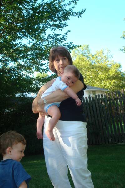 We went to Grandma and Pop-E's again for more BBQ. This time I was awake, so I got to held by Grandma and Daddy, had my picture taken with Grandma and the "BROs" and watch them running around