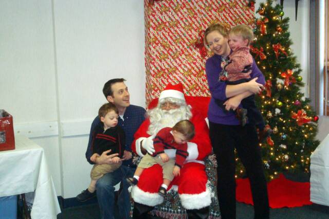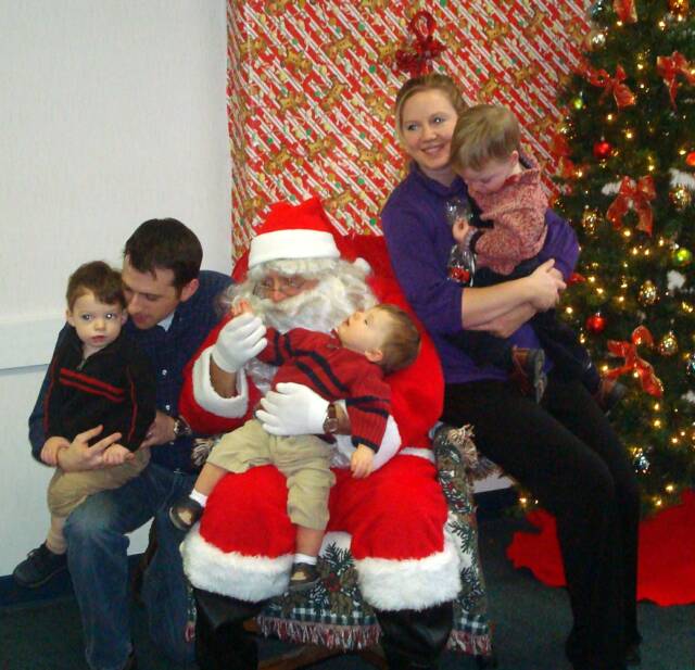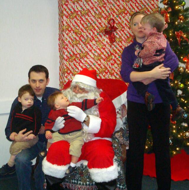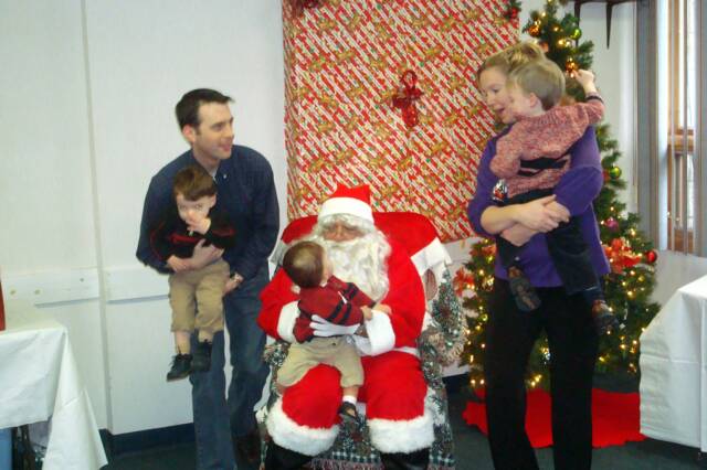 We went to St Helen’s “Breakfast with Santa” with Mommy, Daddy, MeMe, MeMa and Pop-E. PopPop was in Michigan visiting his relatives. We had pancakes, eggs, sausage, juice and cake. Then the big guy showed up in his RED SUIT and Christopher and Daniel were heading for the exit. We finally went in to see him, but you could tell they were not enjoying it. I was having a ball turning my head like a top so he could get a better look at the guy in the RED suit and white beard - I wonder if Pop-E has a red suit!
