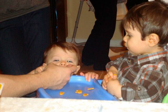 Grandma, Pop-E and Cousin Angela stopped over to see me so Angela could see me for the 1st time. As usual, they wanted to hold me and as usual the "BROs" were eating. It appears that Daniel will eat 24/7 and Christopher just follows along. Which "BRO" do you think I look like?